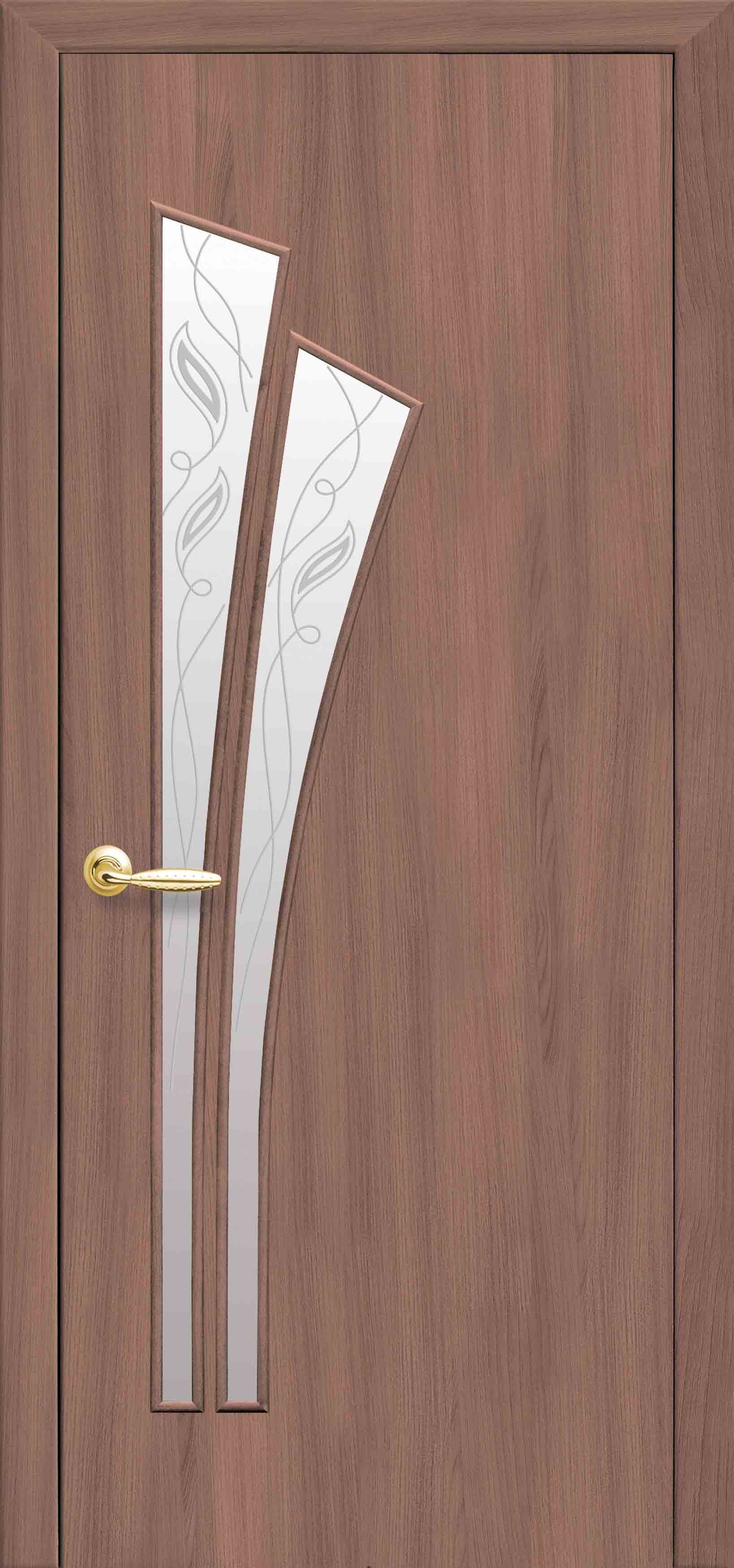 Утонченный рисунок на межкомнатной двери Лилия дополняет фигурные стекла, создавая оригинальную композицию с растительными мотивами. Такая конструкция подходит к стилям кантри, прованс и эко. Изящное небольшое остекление двери пропускает свет, но в то же время создает надежную перегородку для комнаты. Рисунок на стеклянных элементах бывает цветной или прозрачный, что расширяет возможности для выбора одного типа полотна в разные помещения.