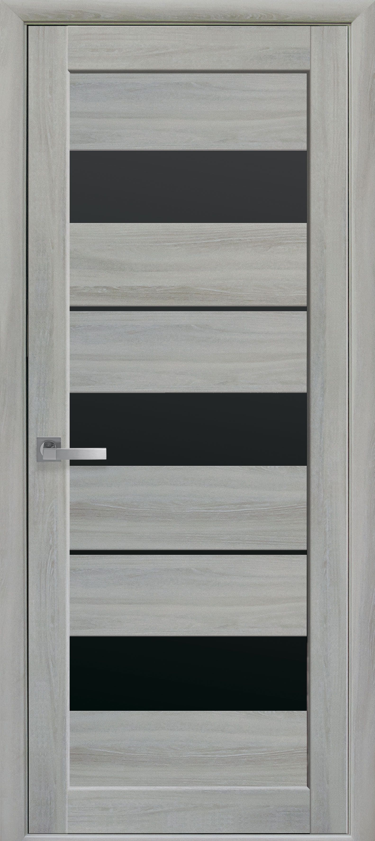 В межкомнатной двери Лилу воплощена идея сочетания в равной степени деревянных и стеклянных элементов. Широкие прозрачные прямоугольники чередуются со стеклянными полосами, которое можно сделать из матового или черного стекла. За счет такого варианта остекления проникает достаточно света в помещении. При этом конструкция сборной двери надежная и крепкая. Внушительный вид дверного полотна передает ощущение защищенности и комфорта.
