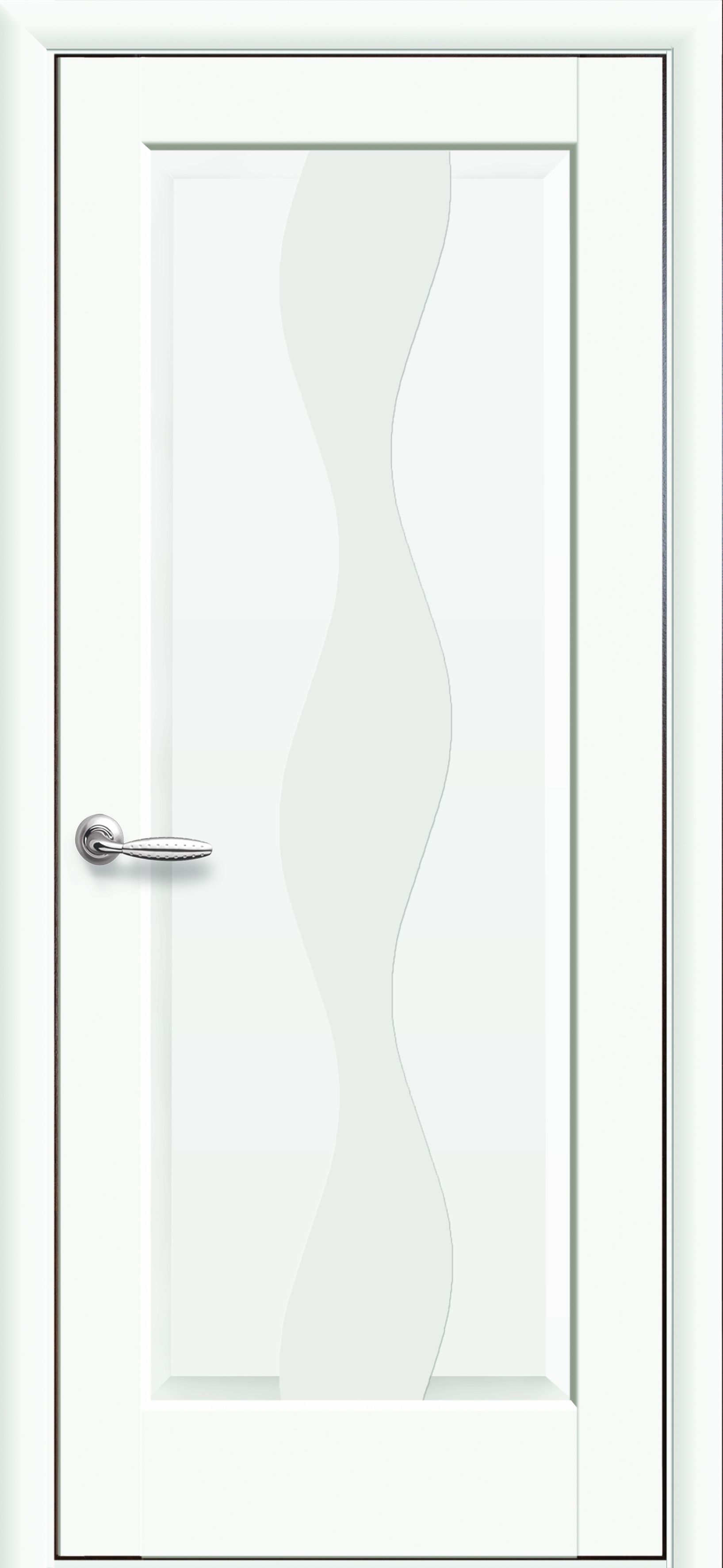 Дизайнерское решение для декоративных элементов межкомнатной двери Волна полностью отображает её название. Абстрактная линия с тремя изгибами делит дверь на два берега, что придает изображению сходство с рекой. Такой мотив успокаивает, передает спокойствие и умиротворение в атмосферу жилища. Дверное полотно бывает остекленное и глухое. Также возможны варианты с узором, нанесенным прозрачной или цветной краской либо выгравированном на глухом полотне.